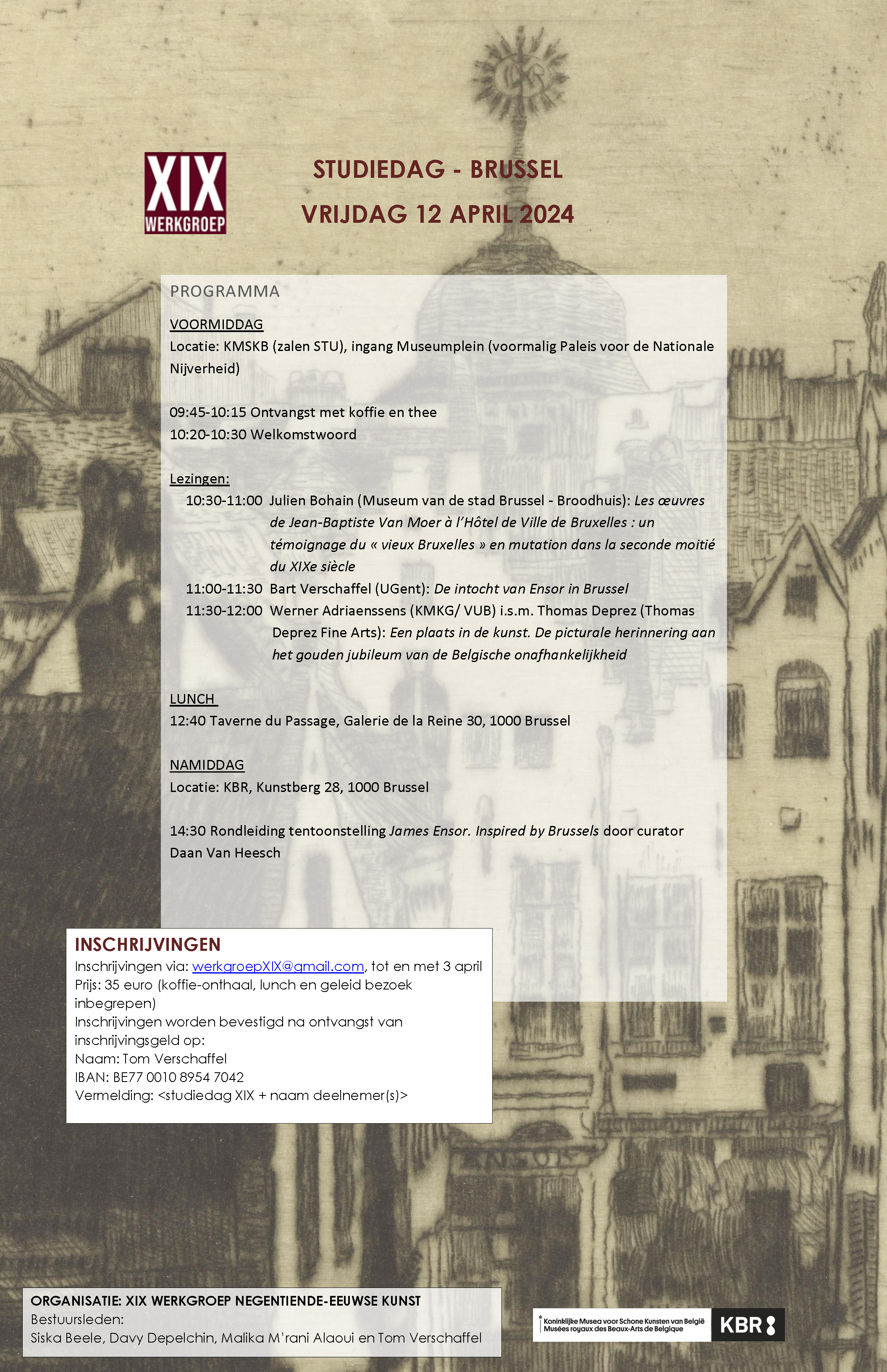 Op vrijdag 12 april 2024 vindt de jaarlijkse studiedag van de Werkgroep XIX plaats in Brussel. We ontvangen u graag vanaf 9u45 in de KMSKB (zalen STU, ingang Museumplein (voormalig Paleis voor de Nationale Nijverheid)). Het programma omvat drie interessante lezingen in de voormiddag, een gezamenlijke lunch en een geleid bezoek aan de KBR in de namiddag.